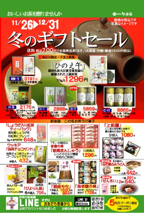 日頃よりお茶の新楽園をご愛顧いただき、誠にありがとうございます。皆様への感謝の気持ちを込めまして、今年も冬のギフトセールとお茶の感謝祭を下記の通り開催いたします。この機会に、ぜひお越しください。