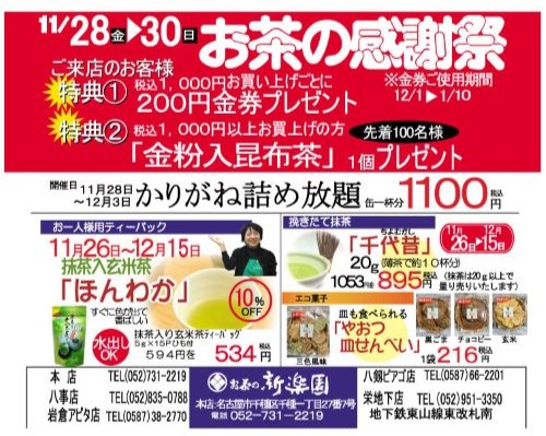 日頃よりお茶の新楽園をご愛顧いただき、誠にありがとうございます。皆様への感謝の気持ちを込めまして、今年も冬のギフトセールとお茶の感謝祭を下記の通り開催いたします。この機会に、ぜひお越しください。 1. 冬のギフトセール